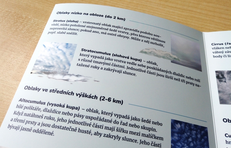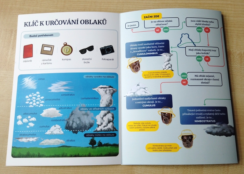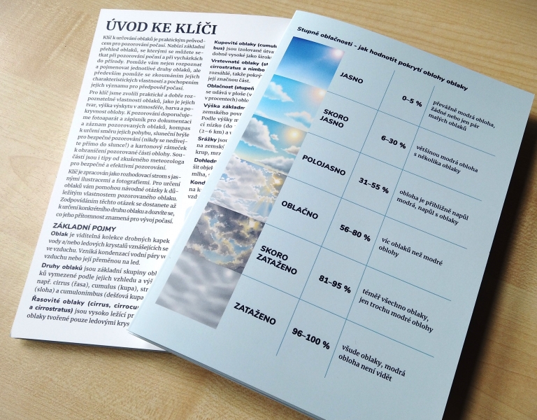 Jedná se o praktický klíč k určování typů oblaků, který využijete zejména venku. Nemusíte být meteorologem – klíč vás povede krok za krokem pomocí přehledného schématu a jednoduhých návodných otázek na základě pozorovaných znaků k identifikaci jednotlivých druhů. Učitelé mohou klíč snadno využit při školní výuce. Zatímco žáci budou pozorovat oblohu, třeba jen z oken třídy, a diskutovat při tom, jaké oblaky vidí, učitel může sledovat jejich práci a pak společně probrat a vyhodnotit, k jakým závěrům došli.