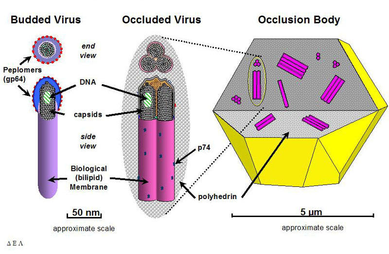 V pokročilé fázi infekce začíná bakulovirus tvořit protein, jehož jediným úkolem je chránit virové částice (viriony). Protein obalí vždy několik virových částic a vytvoří velmi stabilní a odolnou strukturu podobnou krystalu, která je chrání proti vlivům prostředí. Po smrti larvy se tyto struktury dostanou na povrch listu, kde čekají, až je pozře jiná larva. V kyselém prostředí jejího žaludku se pak protein rozpustí, viriony se uvolní a larvu infikují.